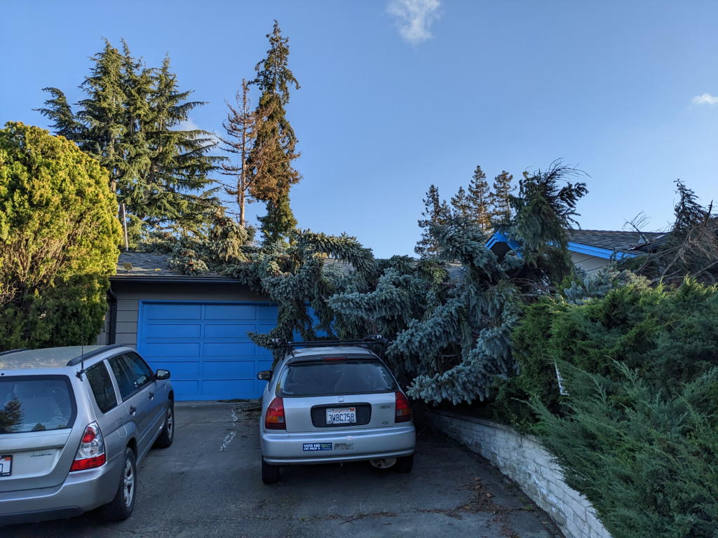 We were cooking dinner at about 5, and there was a big KABOOM! and the house shook. Going outside, we found that the 60-foot blue spruce between our driveway and house had decided to lie down on our garage roof. It had torn its roots out of the soil and pulled up a paving slab from the front walkway.
