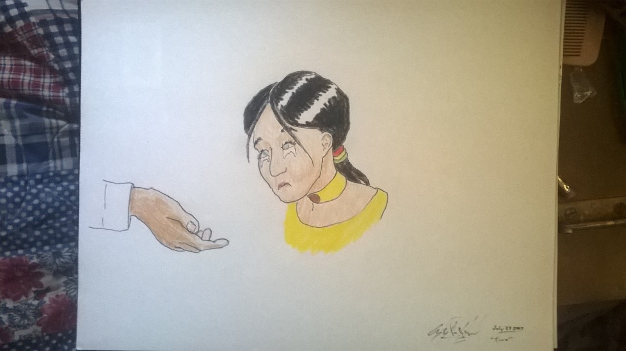 He walked over to her and stood just before her. Her eyes were pleading with his for acceptance, his own eyes full of uncertainty- finally, he caressed her face with his hand, she closed her eyes and wept, a smile breaking across her face.